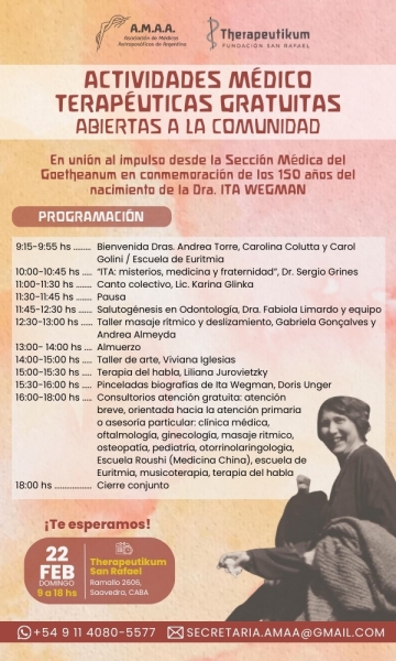 La Asociación de Médicos Antroposóficos de Argentina (AMAA) junto al Therapeutikum San Rafael, en unión al impulso de la Sección Médica del Goetheanum, invitan a participar de una jornada de charlas y talleres abiertos, con atención y orientación gratuita a cargo de profesionales de la salud de diferentes disciplinas y especialidades, como clínica médica, oftalmología, ginecología, masaje rítmico, osteopatía, pediatría, otorrinolaringología, euritmia, musicoterapia, terapia del habla, entre otras.