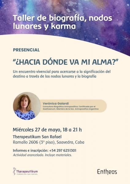 En mayo te invitamos al Taller de Biografía , Nodos Lunares y Karma: “¿Hacia dónde va mi alma?”. Un encuentro vivencial para acercarte a la significación de tu destino a través del estudio de los nodos lunares y el trabajo biográfico. Estará a cargo de Verónica Galardi, Consultora Biográfica Antroposófica certificada por el Goetheanum, titular de “Entheos.Biográfica” y miembro de la Sociedad Antroposófica Argentina.