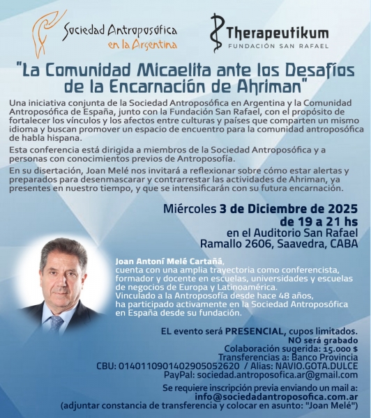 En su disertación, Joan Melé nos invitará a reflexionar sobre cómo estar alertas y preparados para desenmascarar y contrarrestar las actividades de Ahriman, ya presentes en nuestro tiempo, y que se intensificarán con su futura encarnación.